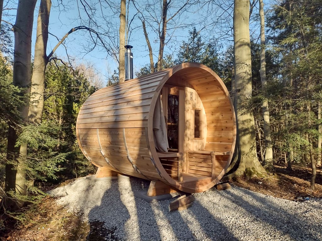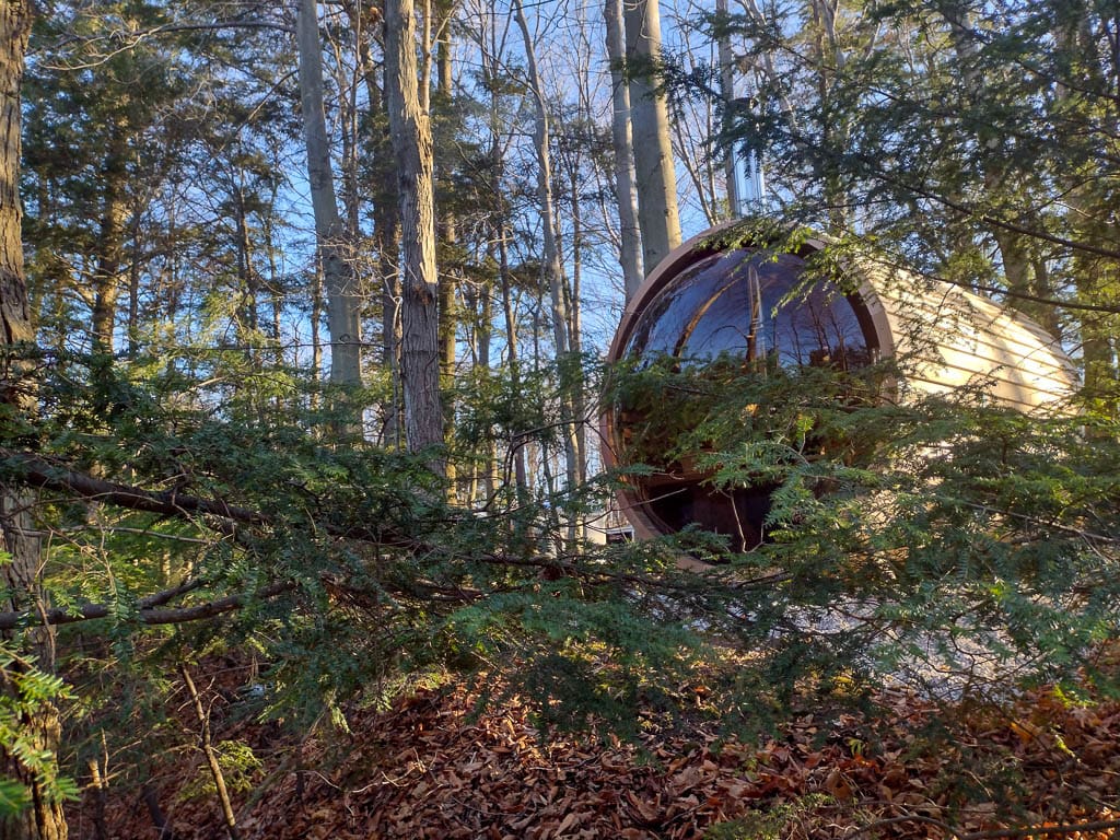 Wood fired cedar barrel sauna with Panoramic dome window overlooking the ravine. This is truly special what a treat.