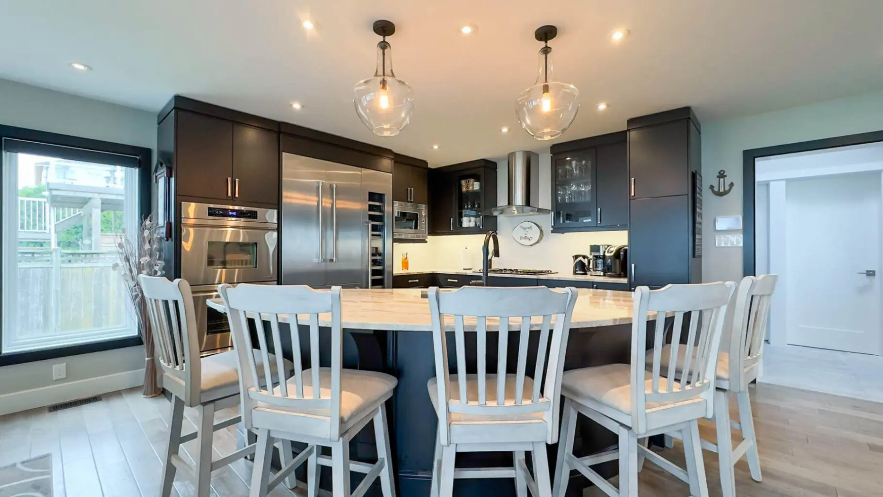 The open-concept layout keeps everyone close, whether you’re preparing meals or just hanging out. The fully equipped kitchen features high-end appliances, a wine fridge, six stools at the island, and a dining table for eight — making it easy for everyone to gather, chat, and enjoy meals together with a view of the lake.