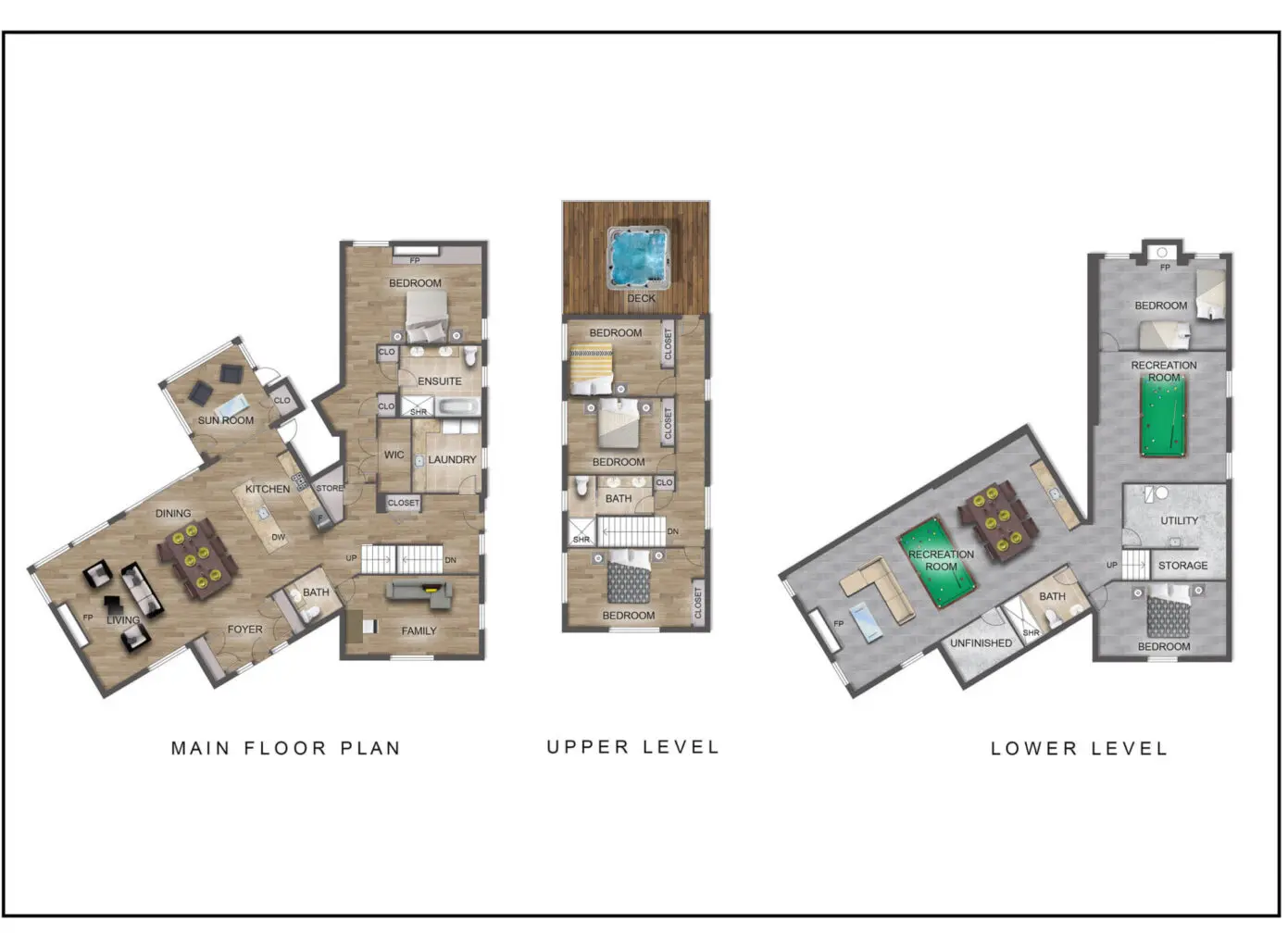 SmartTVs including Disney, Netflix and Crave WiFi (Satellite Internet-speeds not ideal with multiple guests using at once) Gas and Wood Fireplaces Great Room with lots of seating Games Room with Ping Pong, Pool Table, Darts and Bar All seasons room with seating | –Main Level– –Upper Level– –Lower Level– BATHROOMS: Pack N Play/Travel Crib Linens available for extra charge |
